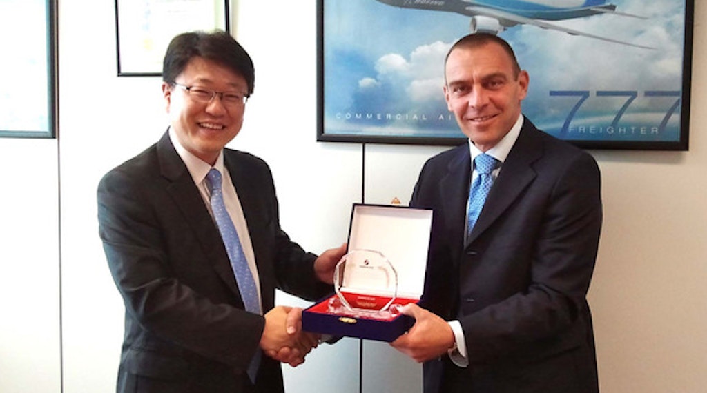 Im Mai 2012 erhielt Alha den zweiten Award of Excellence von Korean Air: Dank seiner exzellenten Abfertigungsleistungen belegte der Flughafen Malpensa in Bezug auf Effizienz und Pünktlichkeit den dritten Platz in der Welt. Als erster europäischer Flughafen war der Flughafen Malpensa nach den großen Drehkreuzen in Hongkong und Atlanta der zweitgrößte. Auf dem Foto: Lorenzo Schettini Gherardini, Executive Vice President der Alha Group (rechts) nimmt den Award of Excellence von Edward Koh, Korean Air Regional Manager North Italy, entgegen.