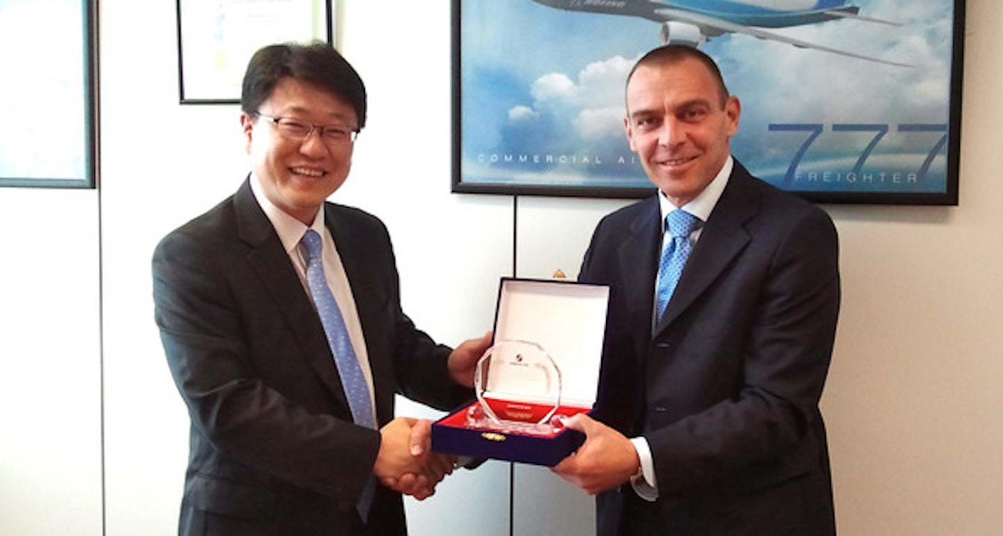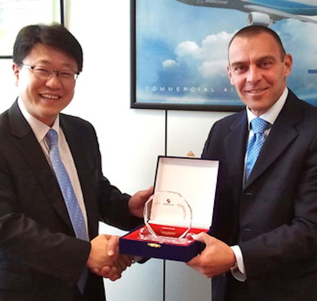 In May 2012, Alha received the second Award of Excellence from Korean Air: thanks to its excellent handling services, Malpensa airport ranked third in the world in terms of efficiency and punctuality. The first European airport, Malpensa airport was second only to the big hubs in Hong Kong and Atlanta. In the photo: Lorenzo Schettini Gherardini, Executive Vice President of the Alha Group (on the right) receives the Award of Excellence from Mr. Edward Koh, Korean Air Regional Manager North Italy.