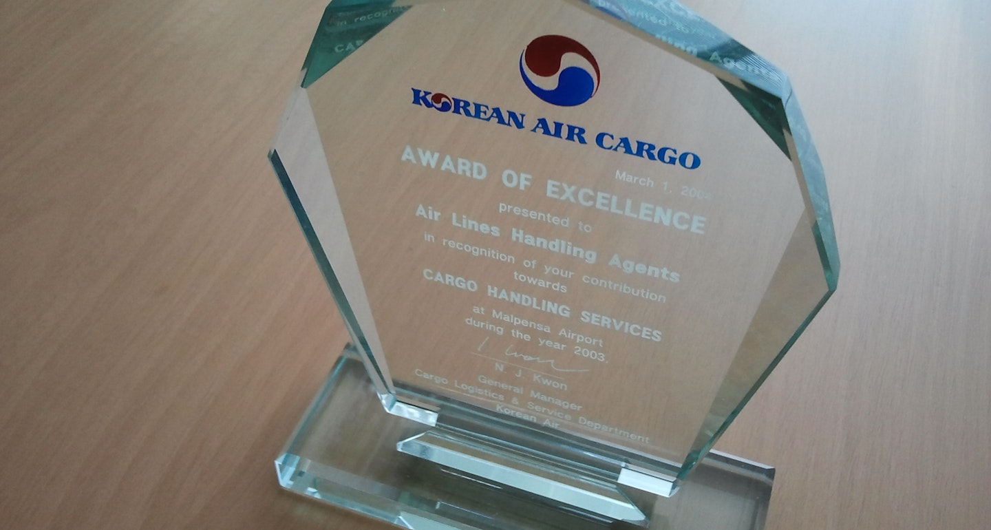 Korean Air awarded Alha Airport with the prestigious Award of Excellence, in recognition of the contribution for the excellent Cargo Handling services provided at the Milan Malpensa airport during the year 2003.