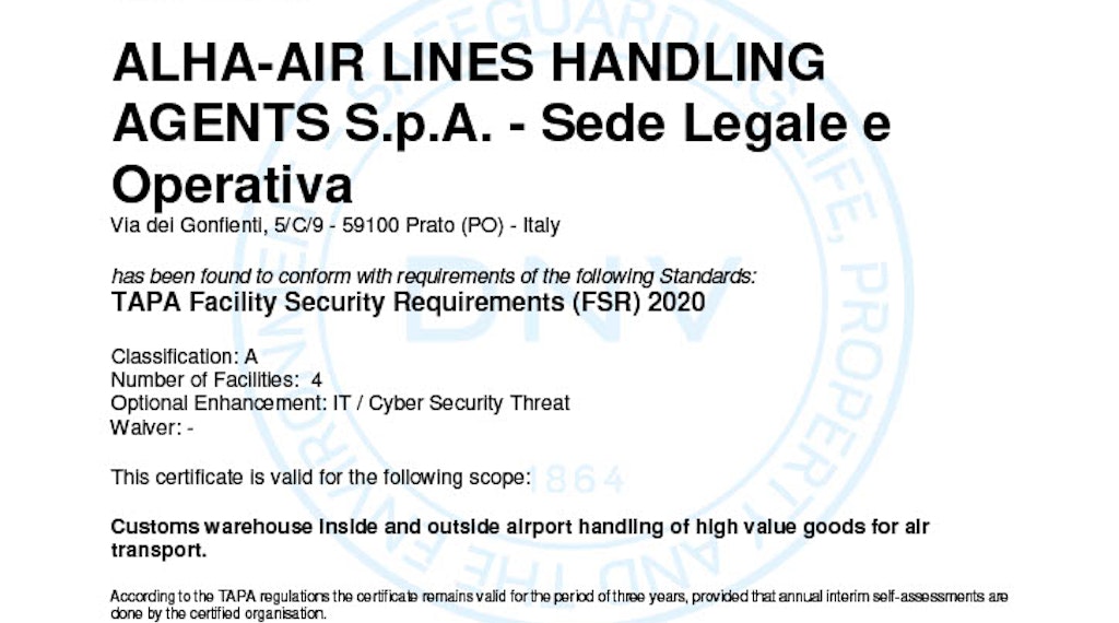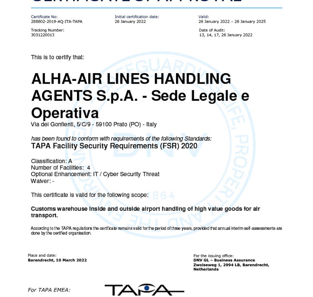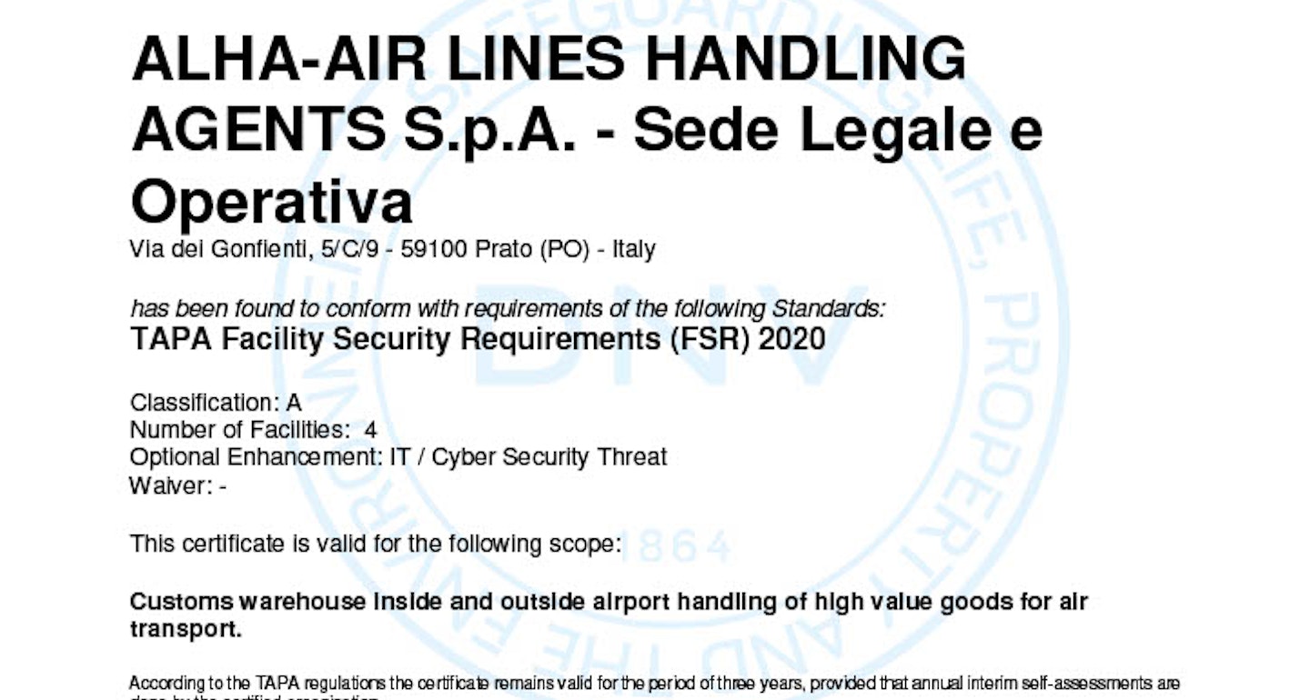 Alha Group recently managed to renew the TAPA FSR-A Multi-Site certification for its main Hubs and , in addition to level A being the highest level, Alha Group has also managed to certify the additional IT & Cyber Security Threat Option.